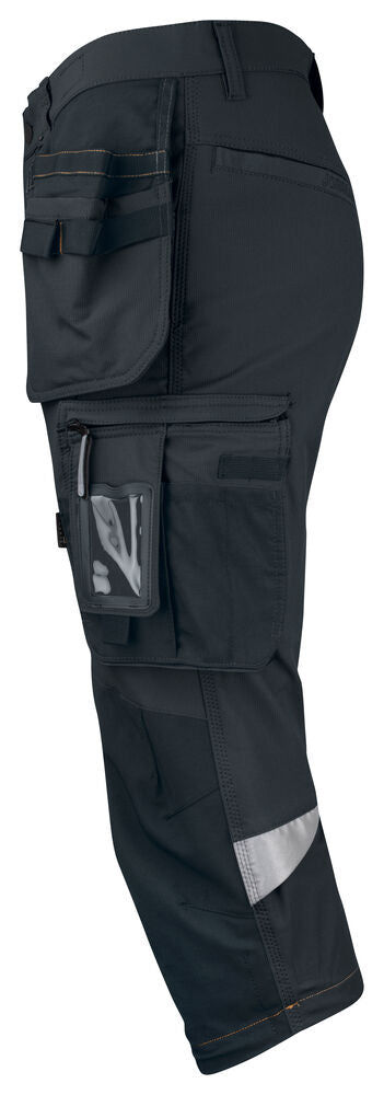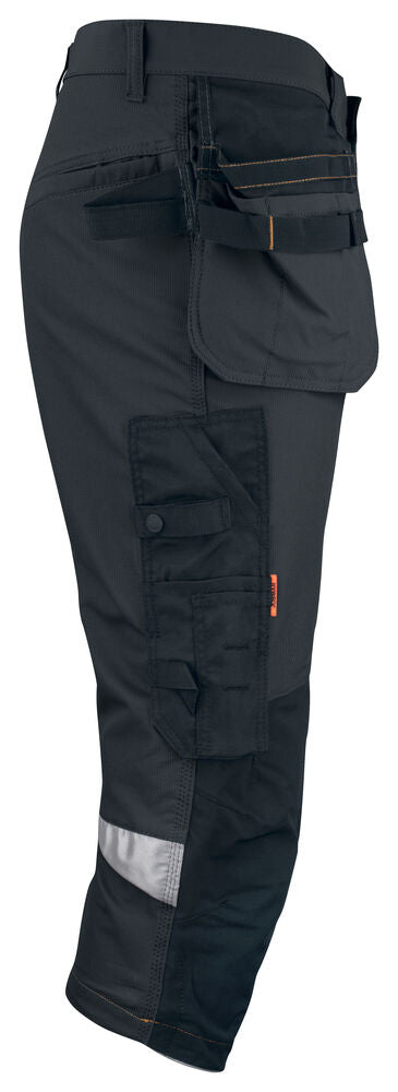Förböjda knän med knäskyddsfickor i slitstark stretch Cordura® med 3M™ reflexpasspoaler och två höjdnivåer. Mesh i knävecken för ventilation. Reflexdetalj för ökad synbarhet i knävecken. Förstärkningar i Cordura® och polyamid.